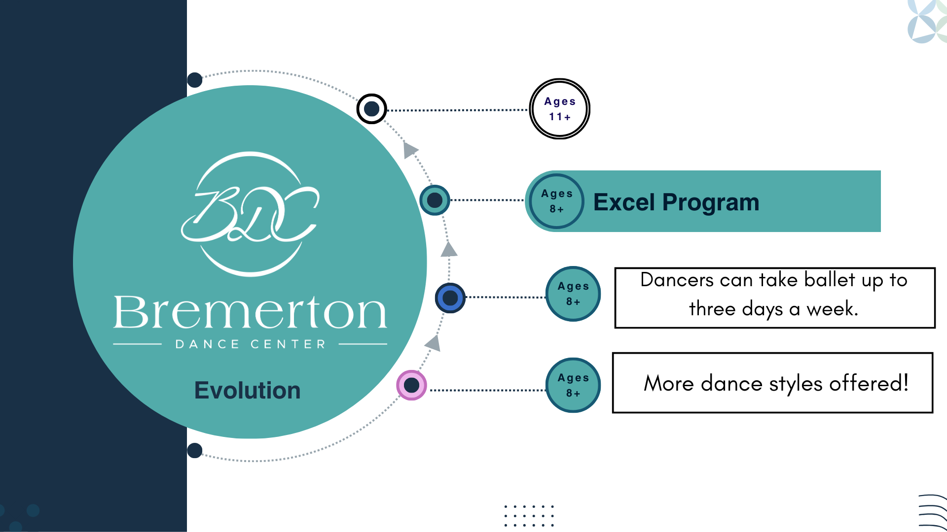 Your dancer’s evolution through Bremerton Dance Center is broken into four steps: Imagine, Foundation, Excel, and Pre-Professional.